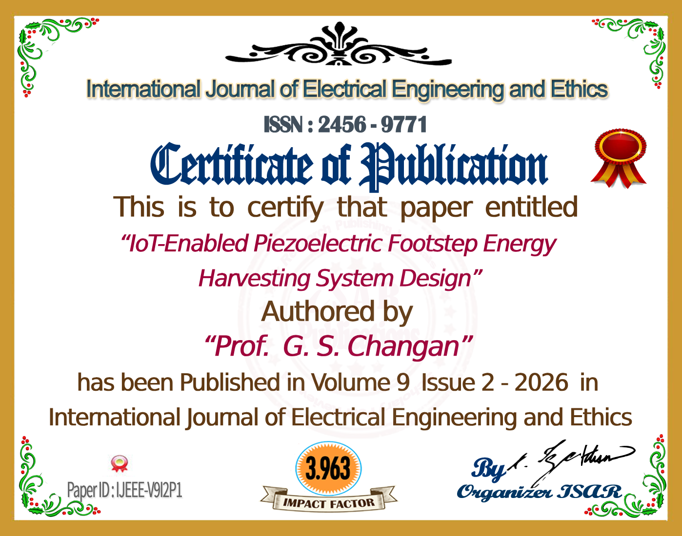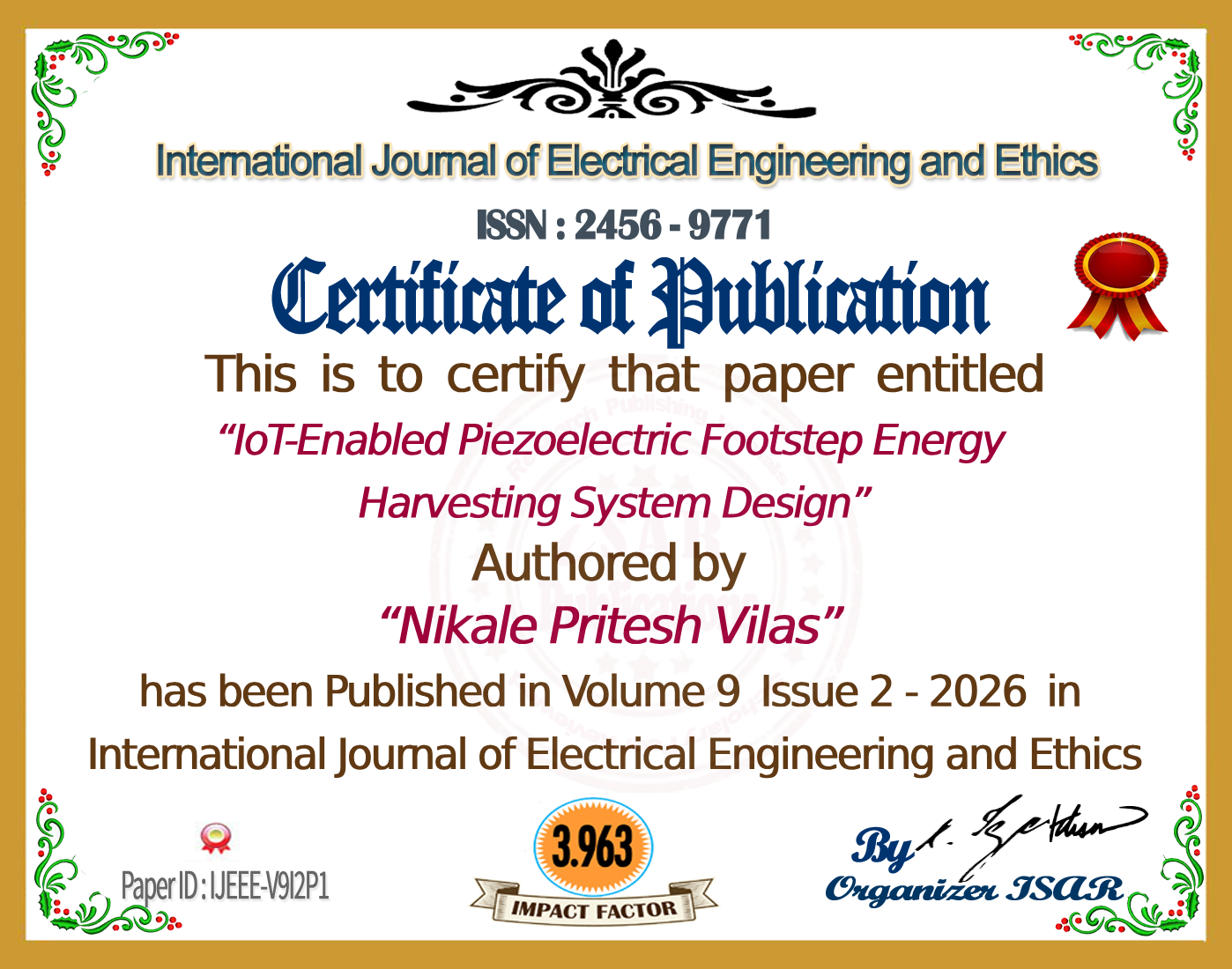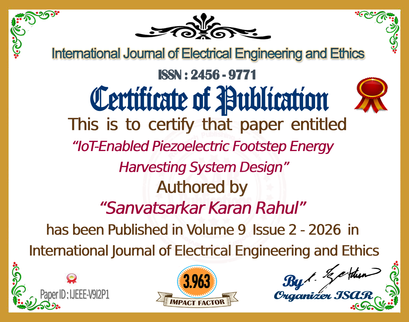 “Harvesting Footstep Energy: Piezoelectric Sensor-Based Power Generation for Sustainable Urban Environments,” International Journal of Creative Research Thoughts (IJCRT), Volume 12, Issue 10, October 2024.